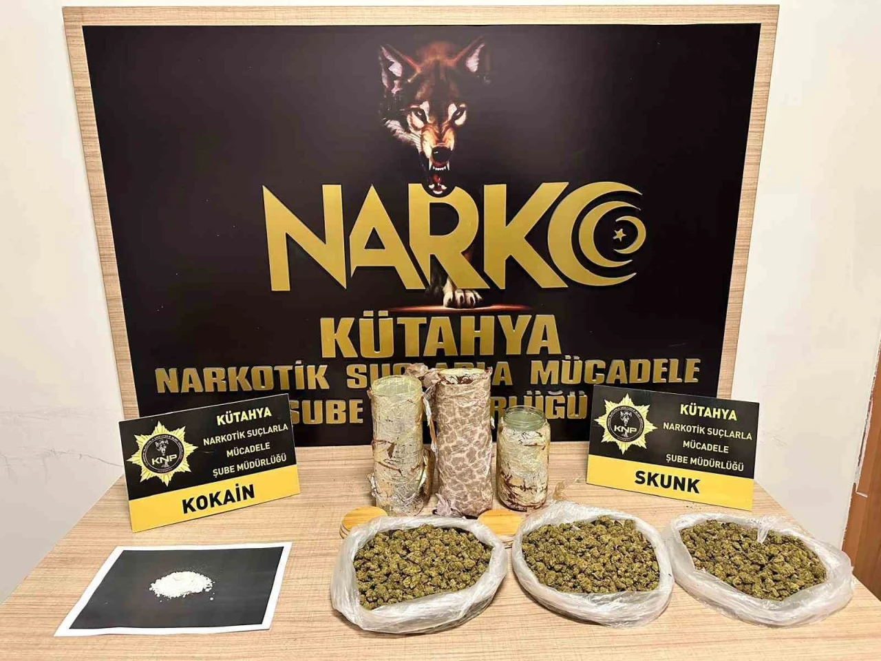 Kütahya’da uyuşturucu kullanımı ve ticaretinin önüne geçmek için çalışmalarına hız kesmeden devam eden İl Emniyet Müdürlüğüne bağlı narkotik ekiplerince Kütahya’ya uyuşturucu madde getirdiği tespit edilen şahıs yakalandı. Şahsın yapılan kontrollerinde, 490 gram skunk ve 8 gram kokain maddesi ele geçirildi.