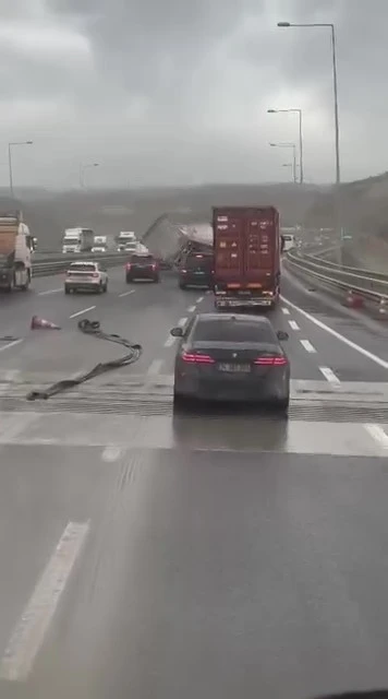 Kuzey Marmara Otoyolu’nun Kocaeli geçişinde seyir halindeki tırın fırtına nedeniyle devrildiği anlar, cep telefonu kamerasına yansıdı.