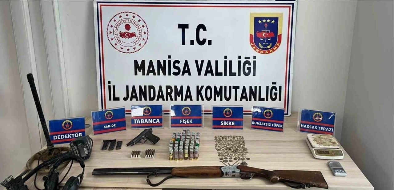 Manisa’nın Salihli ilçesinde jandarma ekiplerince düzenlenen operasyonda çok sayıda tarihi eser, ruhsatsız silah ve dedektör ele geçirildi.
