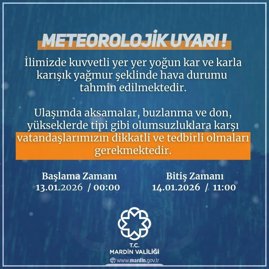 Valilikten yapılan açıklamada, 13 Ocak 2026 Salı günü Dargeçit, Midyat, Mazıdağı ve Savur ilçelerinde bulunan tüm resmi ve özel eğitim-öğretim kurumlarında eğitime bir gün süreyle ara verildiği belirtildi.