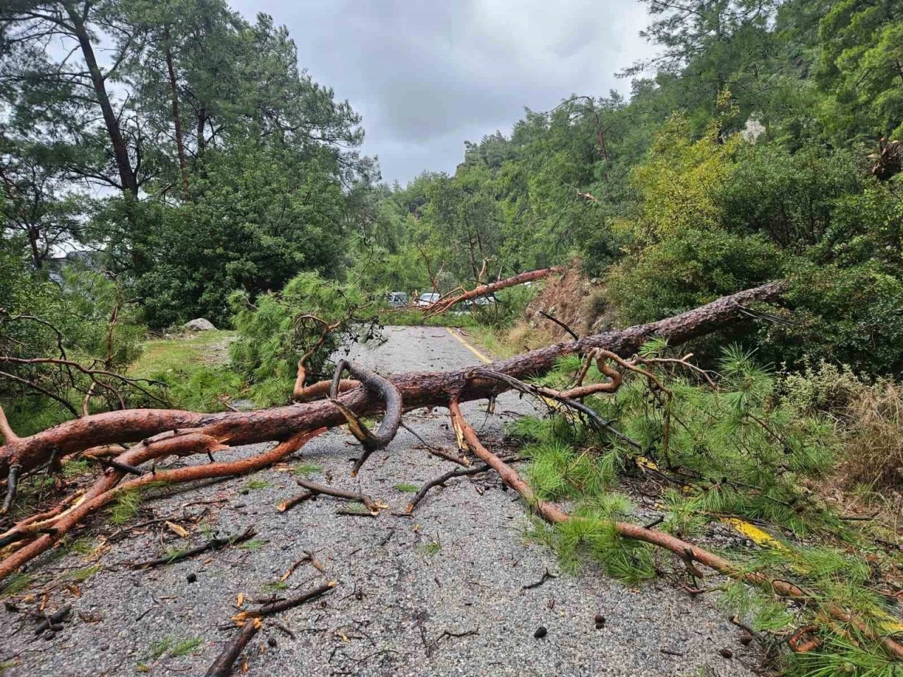 Muğla’nın turistik Menteşe ilçesine bağlı Sarnıç Mahallesi Akbük Mevkii yolunda etkili olan şiddetli yağış ve fırtına, ulaşımı felç etti. Kuvvetli rüzgarın etkisiyle 3 büyük çam ağacı yola devrildi. Edinilen bilgilere göre, Sarnıç Mahallesi’nden Akbük Mevkii’ne ulaşımı sağlayan karayolu, üzerinde etkisini artıran fırtına, yol kenarında bulunan 3 büyük çam ağacını kökünden sökerek yola devirdi. Devrilen ağaçlar nedeniyle yol güzergahı çift yönlü olarak ulaşıma kapandı. Olayın ardından bölge sakinlerinin ihbarı üzerine Menteşe Belediyesi ve Muğla Büyükşehir Belediyesi İtfaiye Daire Başkanlığı ekipleri derhal olay yerine sevk edildi. Ekipler, devrilen tonlarca ağırlıktaki çam ağaçlarını motorlu testereler yardımıyla parçalara ayırarak yoldan kaldırmak için yoğun bir çalışma başlattı. Fırtına nedeniyle Akbük Koyu’nda bağlı teknelerde oluşan dalgalara direnmeye çalıştı. Yetkililer, bölge halkını ve sürücüleri olumsuz hava şartları nedeniyle ağaç devrilmesi ve toprak kayması gibi risklere karşı dikkatli olmaları konusunda uyardı.