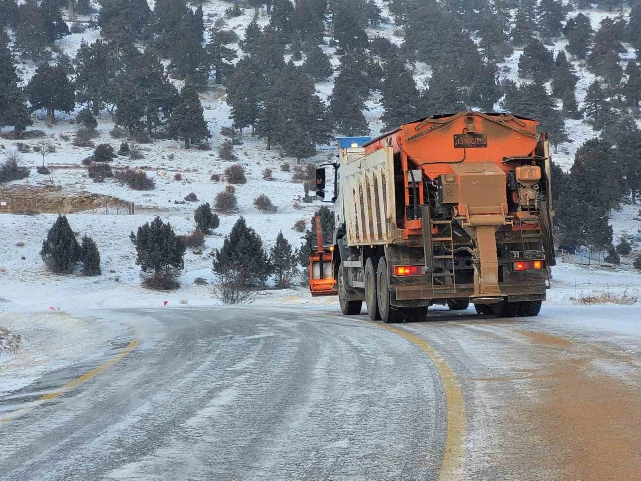 Mersin Büyükşehir Belediyesi ekipleri, Mut ilçesinin yüksek kesimlerinde etkili olan kar yağışı sonrasında kar küreme ve tuzlama çalışmaları yaparak kırsalda yolları açık tutmaya çalışıyor.