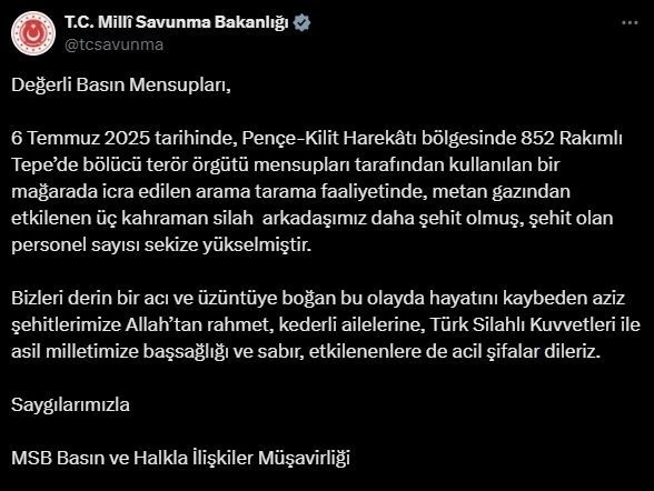 Milli Savunma Bakanlığı’nın sosyal medya hesabından yapılan paylaşımda, Pençe-Kilit Harekatı bölgesinde metan gazından etkilenen 3 askerin daha şehit olduğunu belirtilerek, "6 Temmuz, Pençe-Kilit Harekatı bölgesinde 852 rakımlı Tepe’de bölücü terör örgütü mensupları tarafından kullanılan bir mağarada icra edilen arama tarama faaliyetinde, metan gazından etkilenen üç kahraman silah arkadaşımız daha şehit olmuş, şehit olan personel sayısı sekize yükselmiştir. Bizleri derin bir acı ve üzüntüye boğan bu olayda hayatını kaybeden aziz şehitlerimize Allah’tan rahmet, kederli ailelerine, Türk Silahlı Kuvvetleri ile asil milletimize başsağlığı ve sabır, etkilenenlere de acil şifalar dileriz" ifadelerine yer verildi.