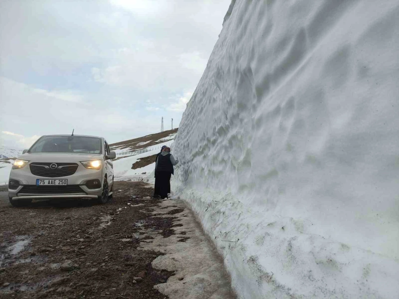 Ardahan’ı Karadeniz Bölgesi’ne bağlayan Şavşat karayolu Sahara geçidi mevkiinde yaklaşık 4 metrelik kar kütlesini görenler durup hatıra fotoğrafı çektiriyor.