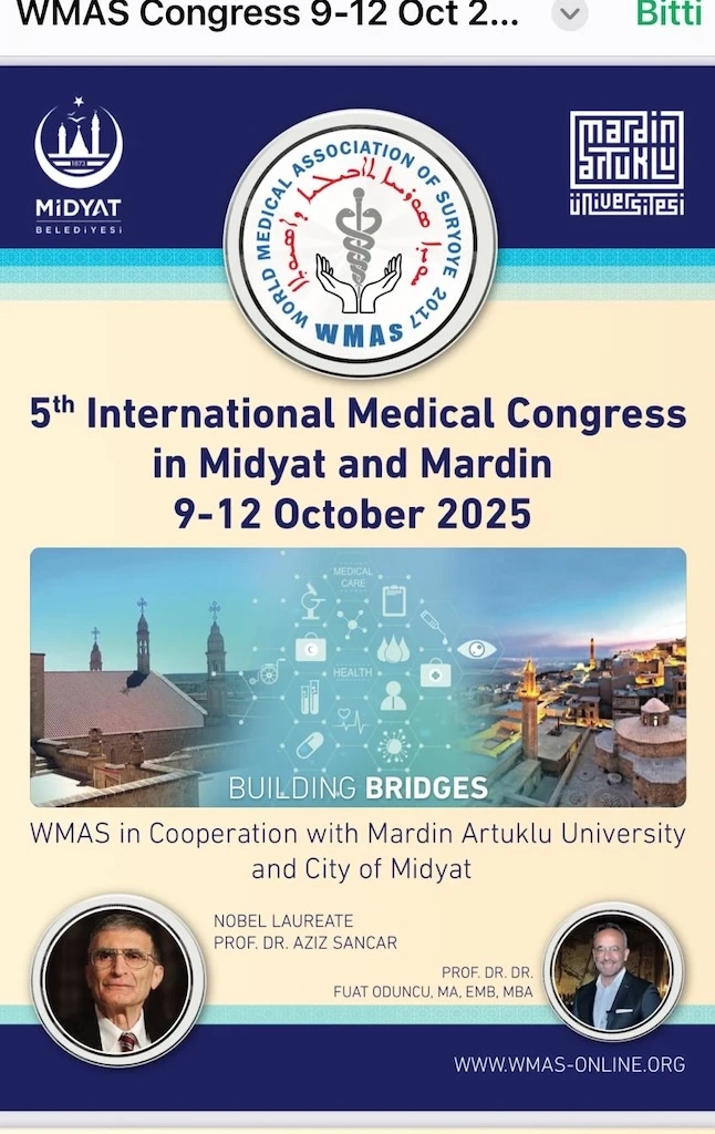 Dünya Süryani Hekimler Birliği (WMAS) tarafından, Mardin Artuklu Üniversitesi ve Midyat Belediyesi iş birliğiyle 9–12 Ekim 2025 tarihleri arasında Midyat ve Mardin’de 5. Uluslararası Tıp Kongresi düzenlenecek.
