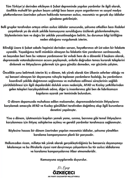 Gaziantep Ak Parti Milletvekili Özkeçeci, bu iddiaların çarpıtılarak ve eksik şekilde kamuoyuna sunulduğunu, sözlerinin tam anlamıyla doğru yansıtılmadığını ve bu durumun bilgi kirliliğine neden olduğunu vurguladı. 6 Şubat’ta yaşanan felaketin tüm Türkiye’yi derinden sarstığını ve o dönemde dayanışma ruhuyla yapılan yardımların depremzedelere ulaştırılması için elinden geleni yaptığını ifade etti.