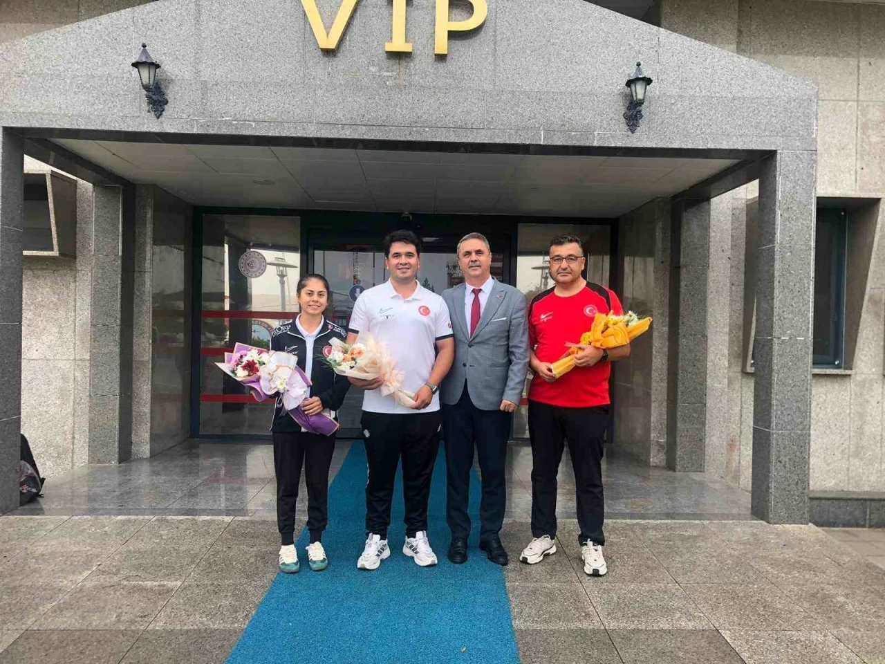 Muğlalı dünya şampiyonu haney havalimanında çiçeklerle karşılandı