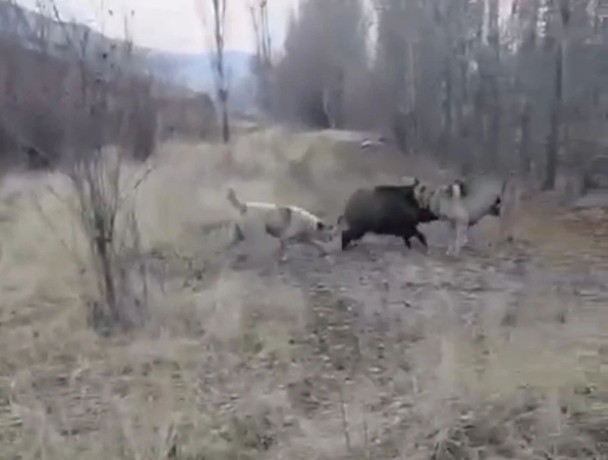 Muş’un Korkut ilçesine bağlı Karakale köyünde tarlaya inen yaban domuzu, çoban köpeklerinin saldırısına uğradı. O anlar cep telefonu kamerasıyla kaydedildi.