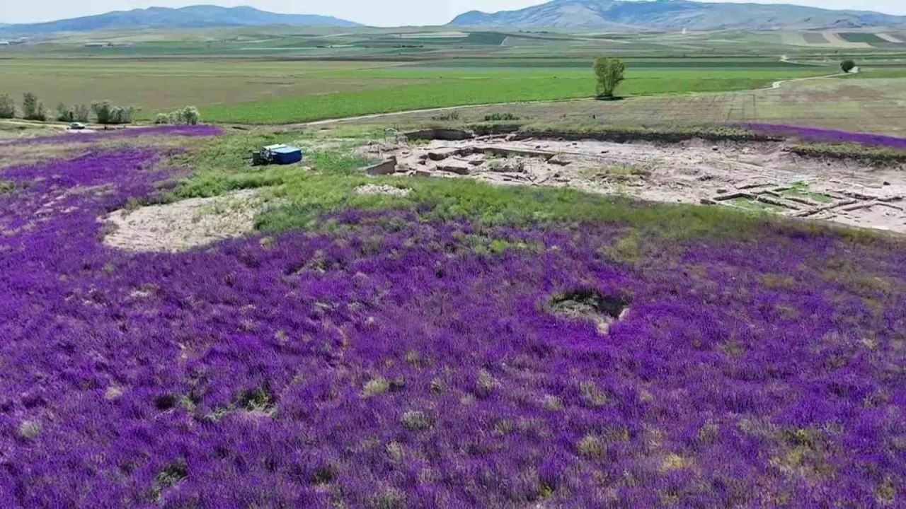 Amasya’daki Oluz Höyük kazı alanını mor çiçekler sardı. Höyükte bu yıl ilk defa karşılaşılan çiçeklerin resitali havadan görüntülendi.