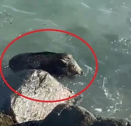 Kaydedilen görüntülerde kıyıya yakın bir noktada ilerlemeye çalışan yaban domuzu olduğu, vatandaşların ise duruma şaşırdığı anlar yer aldı.