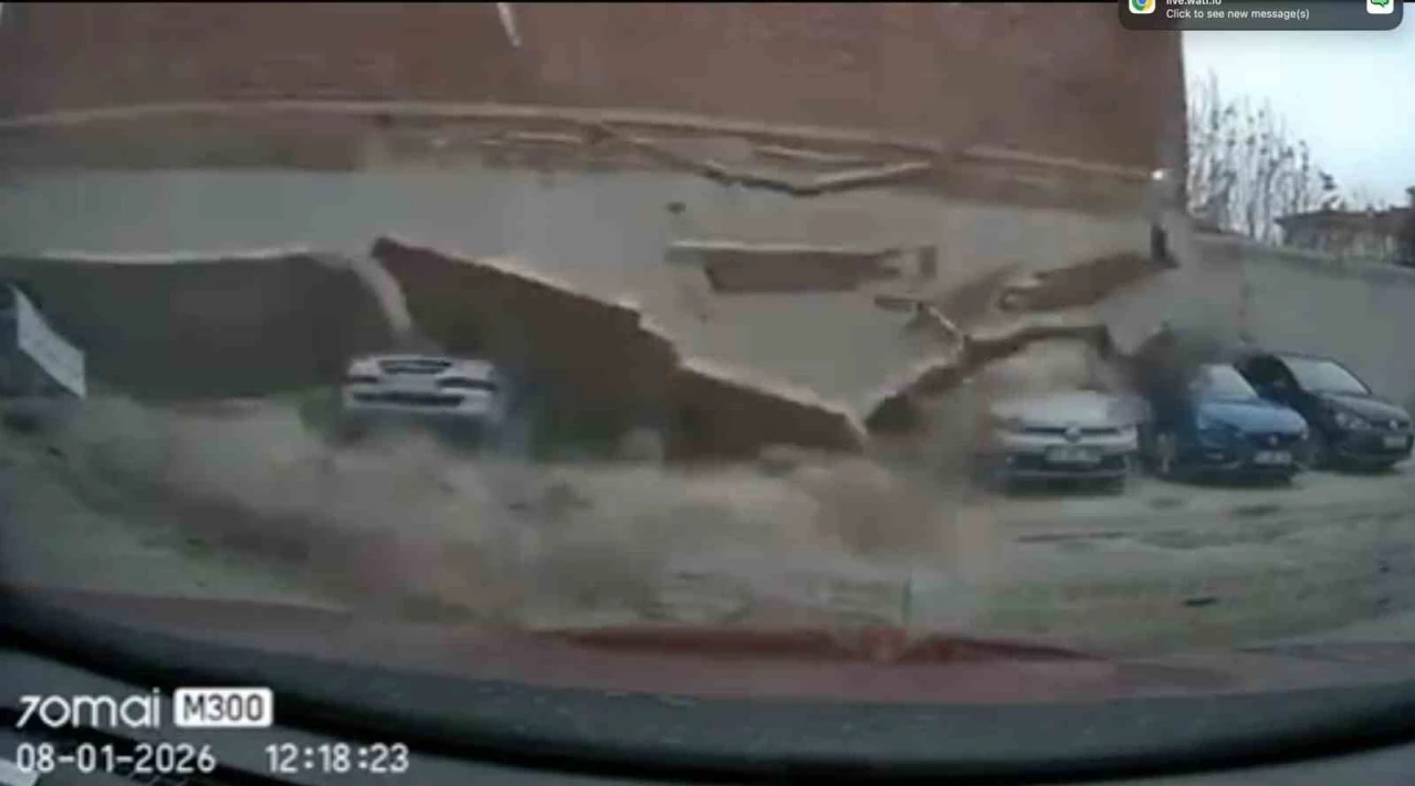 Eskişehir’de dün fırtınanın etkisiyle metruk bir binanın duvarının açık otoparka devrildiği ve 6 araçta hasar oluşturduğu olaya ilişkin araç içi kamera görüntüleri ortaya çıktı.