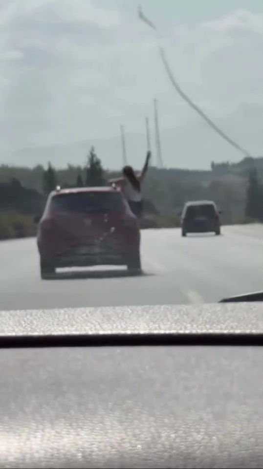 Olay, TAG otoyolunda yaşandı. Alınan bilgiye göre, otoyolda seyrede cipte yolcu olarak bulunan bir kadın cama çıkıp aracın kapısına oturdu. Ellerini de açarak bir süre böyle yolculuk yapan kadın yürekleri ağza getirdi. O anlar başka bir sürücü tarafından cep telefonu ile kaydedildi.