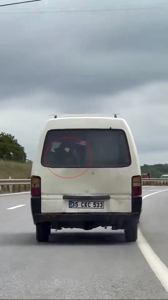 Sakarya’da bir sürücünün, panelvan tipi aracının arkasına yerleştirdiği buzağı ile yolculuğu cep telefonu kamerası ile kaydedildi.