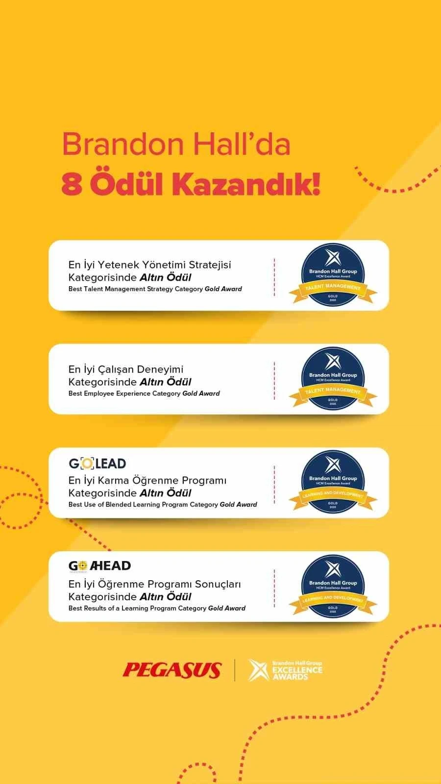 Pegasus Hava Yolları, insan kaynakları uygulamalarıyla Brandon Hall Group HCM Excellence Awards’ta 6 Altın, 1 Gümüş ve 1 Bronz olmak üzere toplam 8 ödül kazandı.