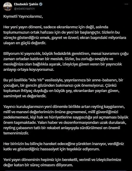 RTÜK Başkanı Ebubekir Şahin sosyal medya hesabından yaptığı paylaşımda, her yeni yayın döneminin sadece ekranlar için değil, aslında toplumun ortak hafızası için de yeni bir başlangıç olduğunu belirterek şu ifadelere yer verdi: