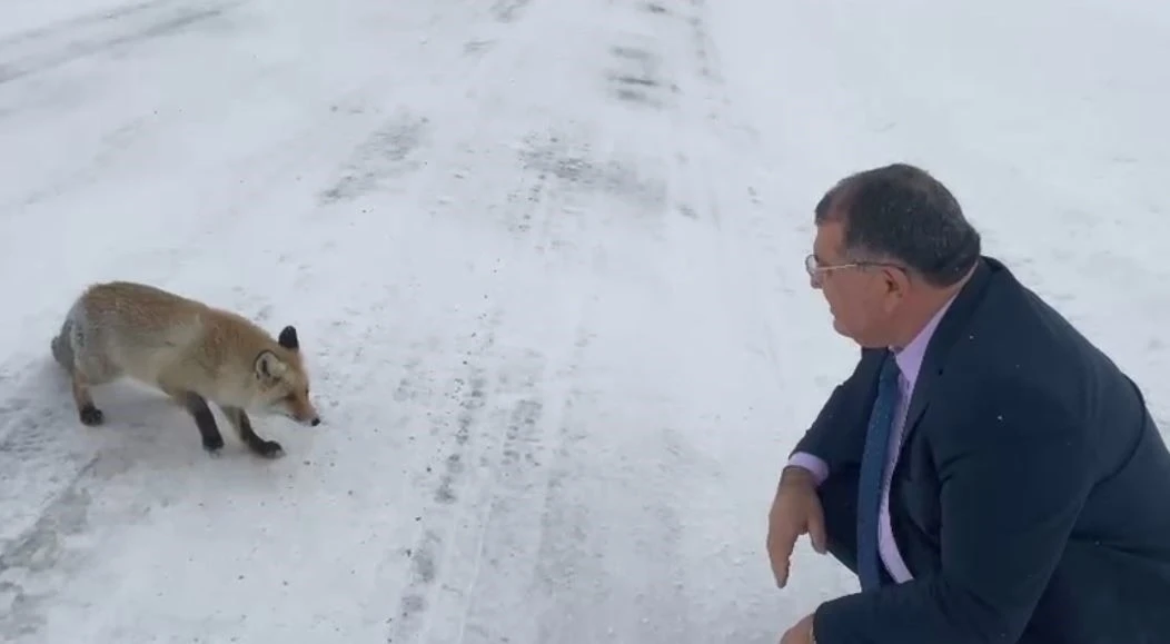 Artvin’in Şavşat ilçesinde Belediye Başkanı Durmuş Aydın, Sahara Geçidi’nde aracıyla seyir halindeyken karlı yolda bir tilkiyle karşılaştı. Yoğun kar yağışının etkili olduğu bölgede yol kenarında duran tilkiyi fark eden Aydın, aracını durdurarak aşağı indi. Soğuk hava ve kar nedeniyle yiyecek bulmakta zorlandığı değerlendirilen tilkiye yiyecek veren Başkan Aydın, hayvanla bir süre ilgilendi. Başkan Aydın’ın tilkiye, "Sen ne güzelsin, ne güzel yüzün var. Görüşürüz bay bay" diyerek seslenmesi dikkat çekti.