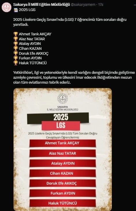 15 Haziran tarihinde yapılan Liselere Geçiş Sistemi (LGS) sınavında Sakarya’dan 7 öğrenci tüm soruları doğru yanıtlayarak 500 tam puan ile birinci oldu.