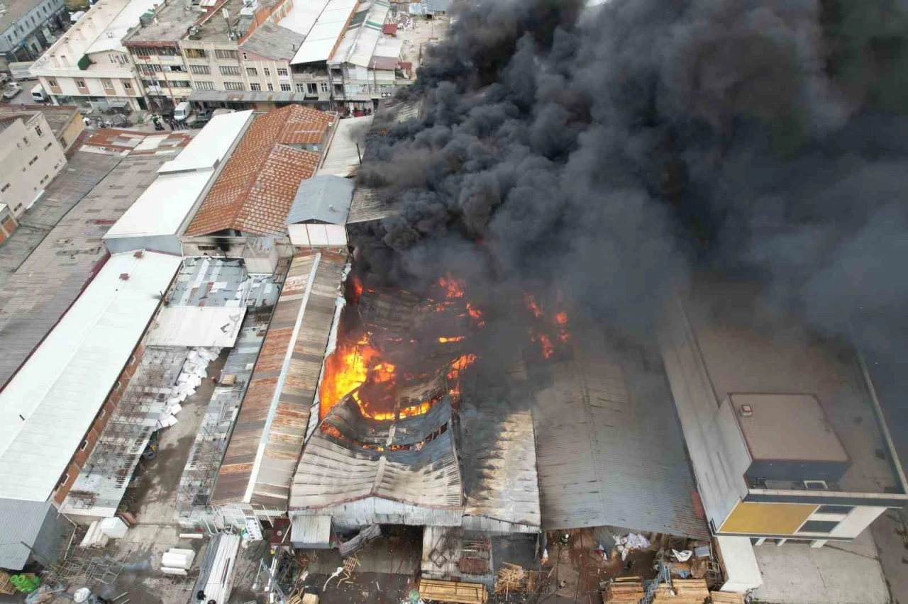 Öte yandan, yanan iş yeri dron ile havadan da görüntülendi.