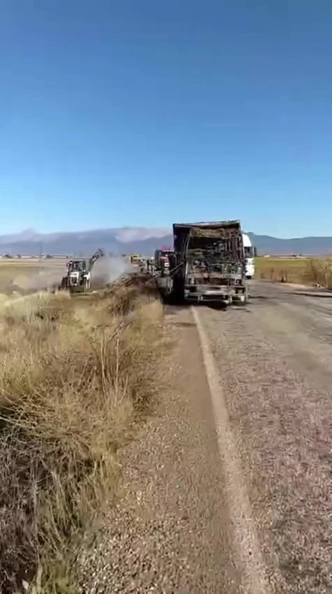Denizli’de saman yüklü kamyon yangın sonrası kullanılamaz hale geldi.
