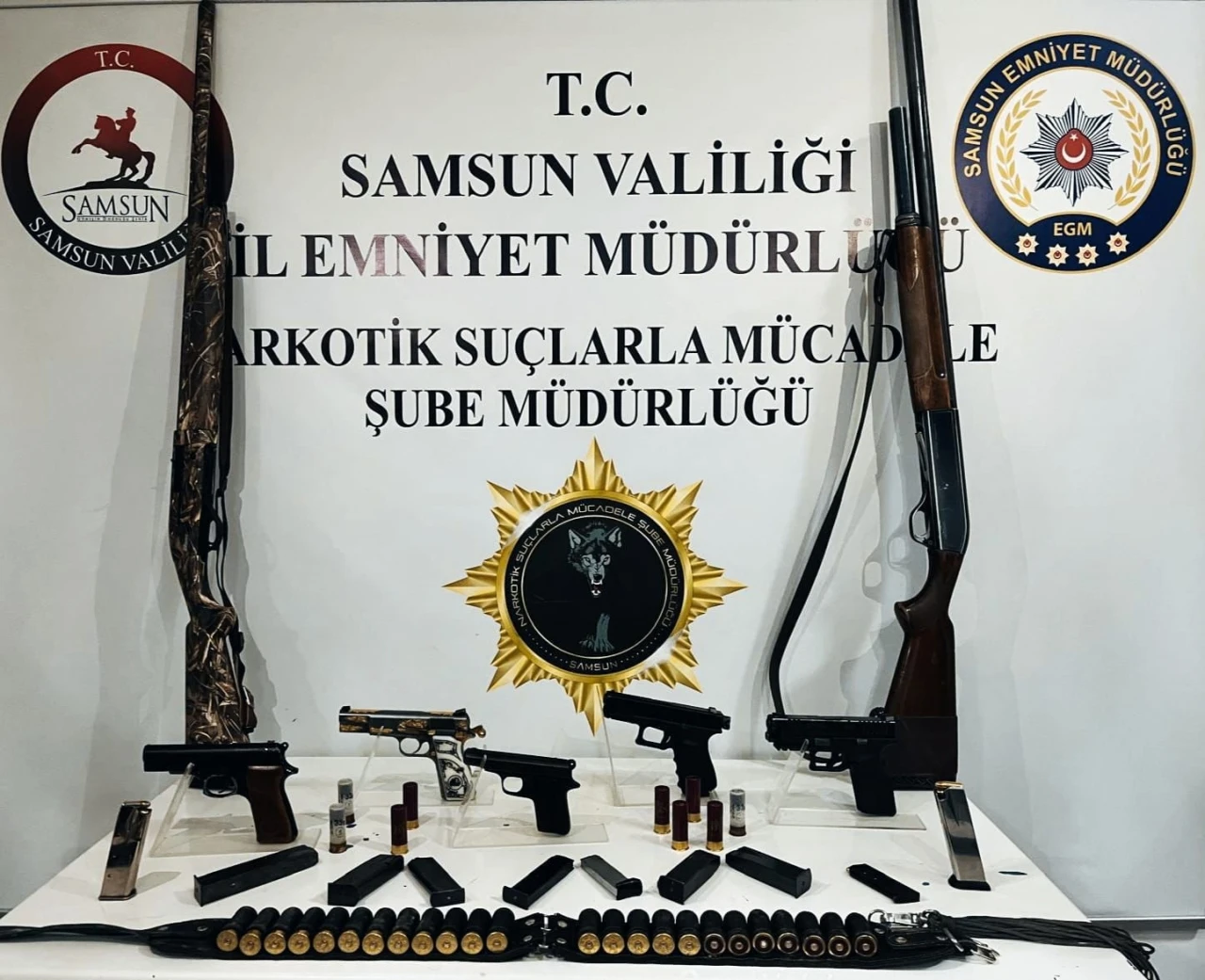 Samsun’da polis tarafından 5 adet tabanca, 2 tüfek, fişek ve kartuş ele geçirilirken, olayla ilgili 2 kişi gözaltına alındı.