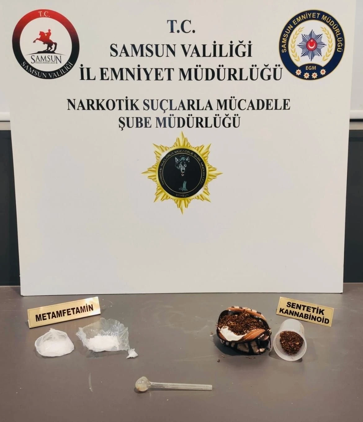 Edinilen bilgiye göre, Samsun Emniyet Müdürlüğü ekipleri, İlkadım ilçesinde S.G. (38) adlı kadının ikametinde arama yaptı. Yapılan aramada, gerçekleştirilen aramada, 20 gram metamfetamin, 25 gram sentetik kannabinoid, 30 ml sentetik kannabinoid yapımında kullanılan sıvı madde, 1 adet sentetik ecza, ve 1 adet uyuşturucu madde kullanma aparatı ele geçirilmiştir. Olayla ilgili S.G. adlı kadın gözaltına alındı. Soruşturma devam ediyor.