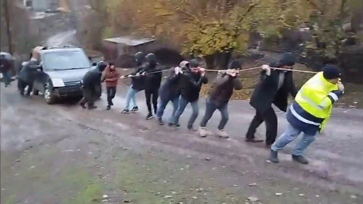 Köy sakinleri, halat bağladıkları ve yaklaşık 30 metre yokuş yukarı çektikleri aracı, düzlüğe çıkardı. Dayanışma örneği gösteren yaklaşık 15 kişi, daha sonra aracı pikaba yükledi. Kaza sonrası o anlar, cep telefonu ile görüntülendi.