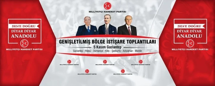 Edinilen bilgilere göre, "2024'e Doğru: Diyar Diyar Anadolu’’ temalı Genişletilmiş Bölge İstişare Toplantısı, 5 Kasım Pazar günü saat 12.00’de Şehitkamil Kültür Merkezi’nde başlayacak. Toplantıya, MHP Genel Başkan Yardımcısı Yaşar Yıldırım, MYK Üyesi ve Gaziantep Milletvekili Sermet Atay, MYK Üyesi Ali Fuat Kardaş, Şanlıurfa Milletvekili İbrahim Özyavuz, Hatay Milletvekili Lütfü Kaşıkçı, Kilis Milletvekili Mustafa Demir’in yanı sıra, Mardin, Şanlıurfa, Adıyaman, Osmaniye, Hatay, Kilis il ve ilçe Teşkilatları, Belediye Başkanları, İl Genel ve Belediye Meclis üyeleri de katılacak.
