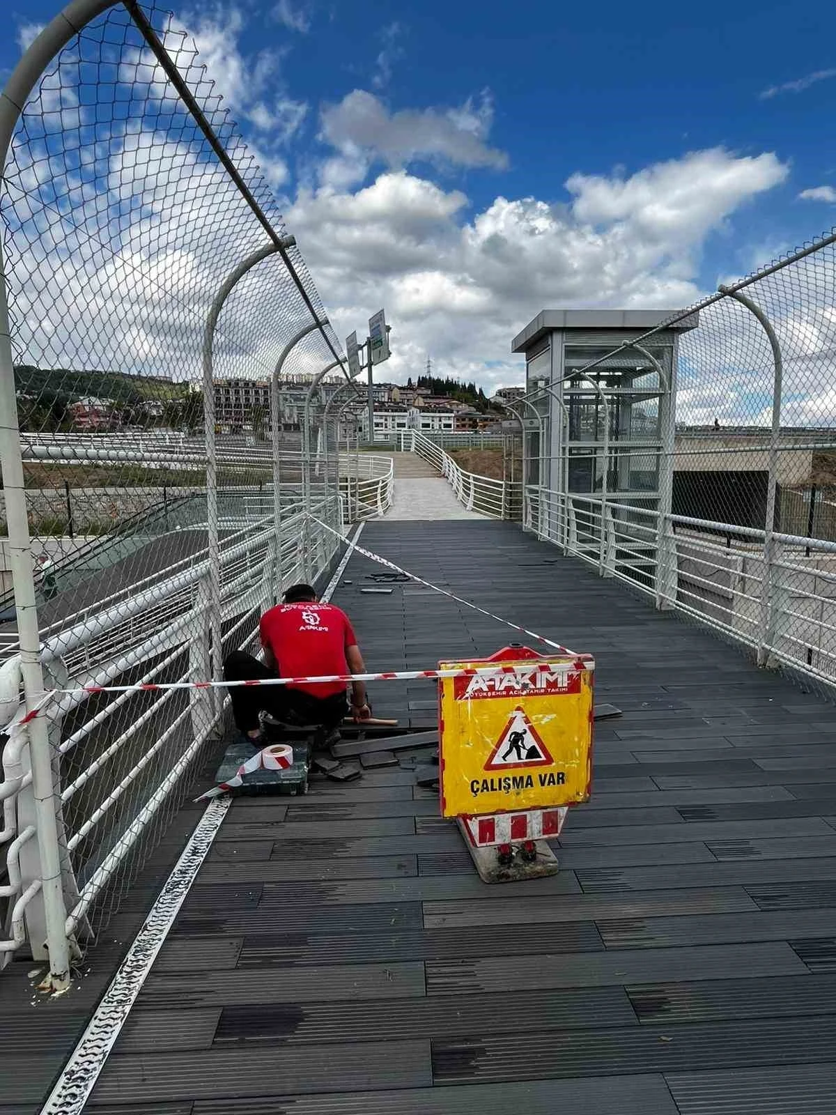 Kocaeli Şehir Hastanesi üst geçidinde bakım çalışması yapan ekipler, üst geçitte tespit edilen yapısal sorunları gidermek üzere eskiyen kaydırmaz zeminde tadilat ve tamirat gerçekleştirdi.