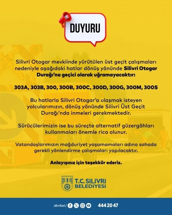 Silivri Otogar lokasyonunda yapılan üst geçit çalışmaları nedeniyle, 9 Nisan Çarşamba gününden itibaren bazı otobüs hatları dönüş yönünde Silivri Otogar Durağına uğramayacak. Silivri Otogar Durağına uğrayamayacak hatlar şu şekilde: