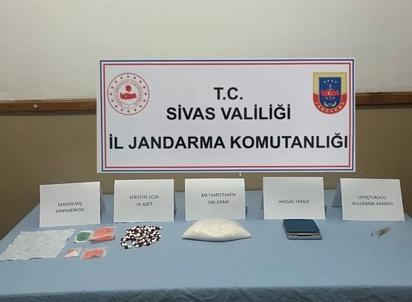 Sivas İl Jandarma Komutanlığı, uyuşturucu veya uyarıcı madde imal ve ticaretinin önlenmesine yönelik çalışmalarını sürdürüyor. Alınan istihbarat ve doğrultusunda Ulaş ilçesinde icra edilen operasyonda; 500 gram metamfetamin, 58 adet sentetik uyuşturucu hap (lyrica), 100 kullanımlık kâğıda emdirilmiş sentetik kannabinoid, 1 adet hassas terazi, 1 adet uyuşturucu kullanma aparatı ele geçirildi.