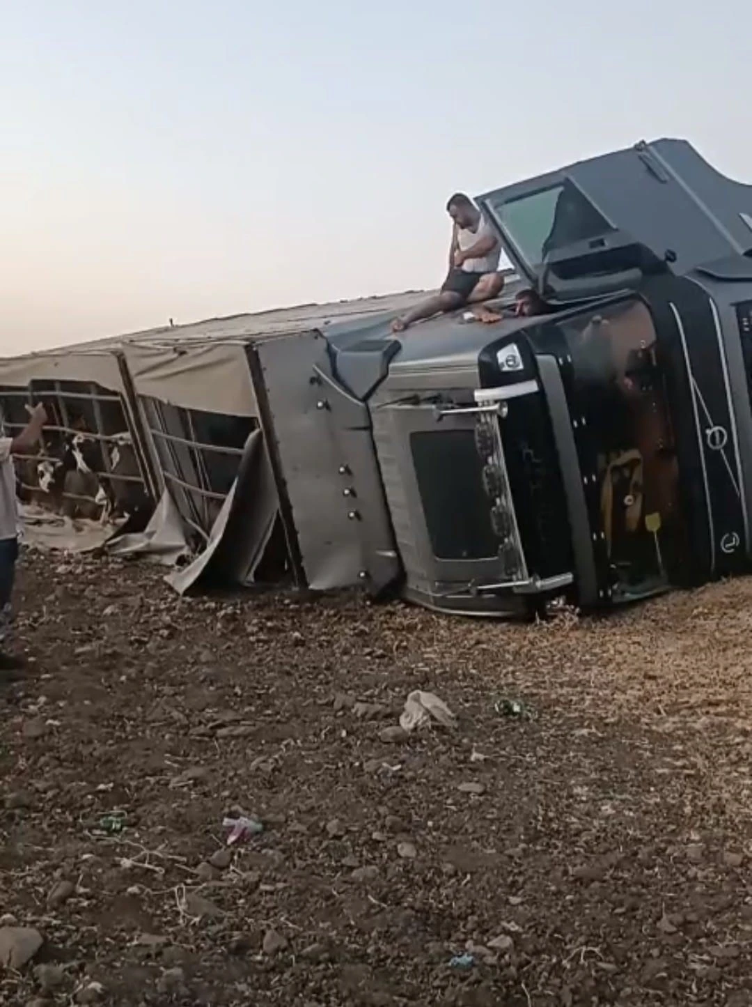 Şanlıurfa’nın Siverek ilçesinde büyükbaş hayvan taşıyan bir tır, sürücüsünün direksiyon hakimiyetini kaybetmesi sonucu şarampole devrildi. Kazada tır sürücüsü yaralanırken bazı hayvanlar da zarar gördü.
