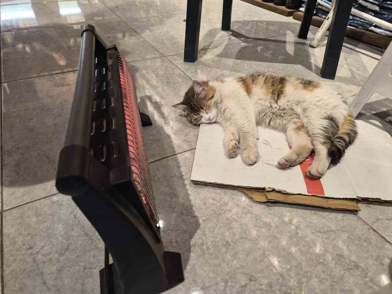 Eskişehir’de soğuktan üşüyen bir sokak kedisi, ısınmak için sığındığı bakkal dükkanında elektrikli ısıtıcının karşısına geçip uyudu.