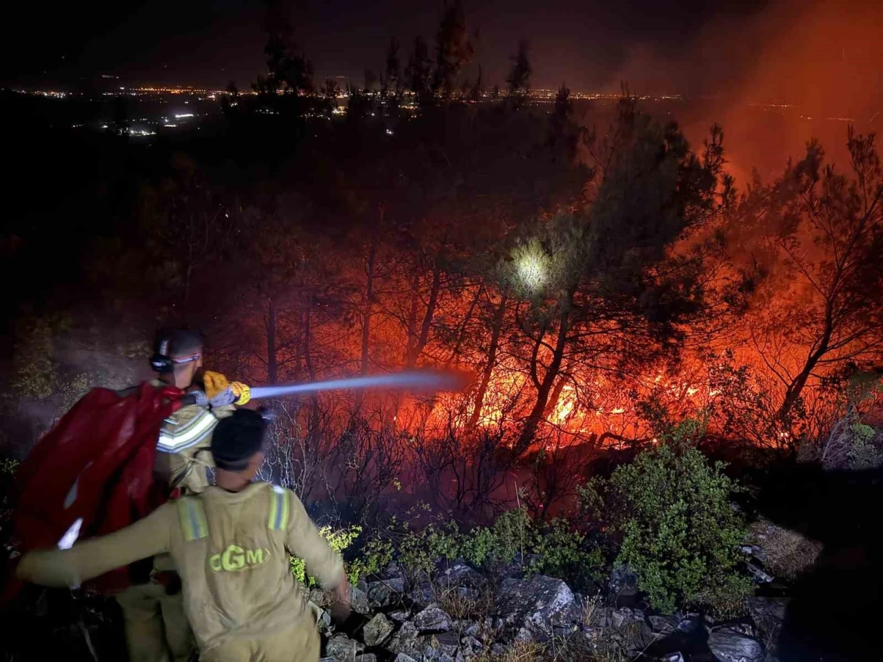 Havanın kararması ile birlikte bölgede alevler geceyi aydınlatırken, ekiplerin yangınla mücadelesi sürüyor.