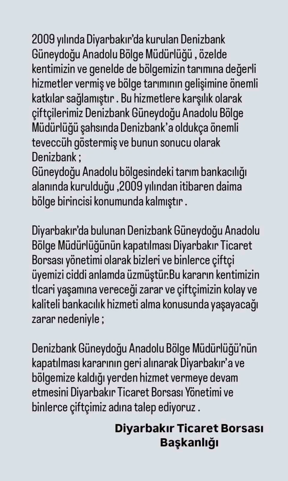 Diyarbakır Ticaret Borsasından yapılan açıklamada, "2009 yılında Diyarbakır’da kurulan Denizbank Güneydoğu Anadolu Bölge Müdürlüğü, özelde kentimizin ve genelde de bölgemizin tarımına değerli hizmetler vermiş ve bölge tarımının gelişimine önemli katkılar sağlamıştır. Bu hizmetlere karşılık olarak çiftçilerimiz Denizbank Güneydoğu Anadolu Bölge Müdürlüğü şahsında Denizbank’a oldukça önemli teveccüh göstermiş ve bunun sonucu olarak Denizbank Güneydoğu Anadolu Bölgesindeki tarım bankacılığı alanında kurulduğu, 2009 yılından itibaren daima bölge birincisi konumunda kalmıştır. Diyarbakır’da bulunan Denizbank Güneydoğu Anadolu Bölge Müdürlüğünün kapatılması Diyarbakır Ticaret Borsası yönetimi olarak bizleri ve binlerce çiftçi üyemizi ciddi anlamda üzmüştür. Bu kararın kentimizin ticari yaşamına vereceği zarar ve çiftçimizin kolay ve kaliteli bankacılık hizmeti alma konusunda yaşayacağı zarar nedeniyle Denizbank Güneydoğu Anadolu Bölge Müdürlüğünün kapatılması kararının geri alınarak Diyarbakır’a ve bölgemize kaldığı yerden hizmet vermeye devam etmesini Diyarbakır Ticaret Borsası Yönetimi ve binlerce çiftçimiz adına talep ediyoruz" denildi.