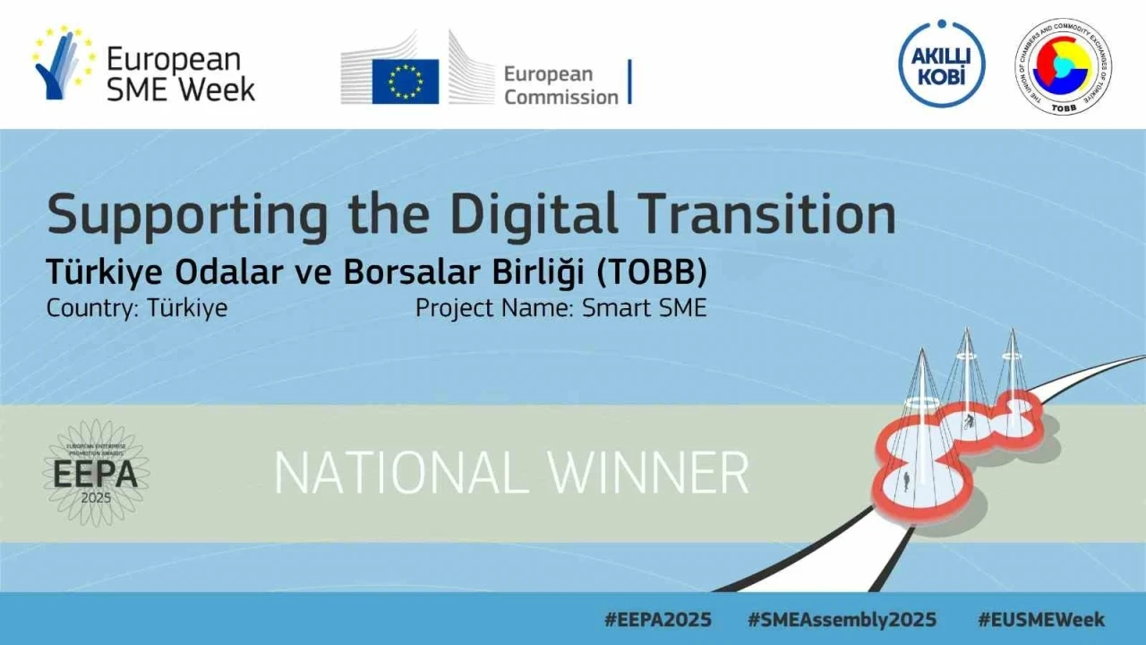 TOBB tarafından KOBİ’lerin dijital dönüşümüne destek amacıyla hayata geçirilen Akıllı KOBİ Platformu, Avrupa Komisyonu tarafından düzenlenen 2025 Avrupa Girişimciliği Teşvik Ödülleri (European Enterprise Promotion Awards - EEPA) kapsamında ‘Dijital Dönüşümün Desteklenmesi’ kategorisinde Türkiye Ulusal Şampiyonu (National Winner) seçildi. Ulusal koordinasyonu KOSGEB tarafından yürütülen yarışma için, 2025 yılında Türkiye’den 39 farklı başvuru alındı.