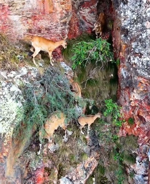Torul Kalesi’nin sarp kayalıklarındaki yaban keçileri dron kamerasına yansıdı.