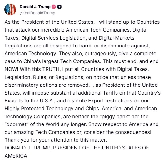 ABD’li teknoloji şirketlerini olumsuz etkileyen uygulamalara başvuran ülkelere seslenen Trump "ABD Başkanı olarak, dijital vergiler, mevzuatlar, kurallar veya düzenlemeler uygulayan ülkeler bu ayrımcı uygulamalara son vermedikleri takdirde, ABD ile yaptıkları ihracata ek gümrük vergileri getireceğim ve yüksek koruma altındaki teknolojilerimiz ve çiplerimiz üzerinde ihracat kısıtlamaları uygulayacağım" dedi. Dünya ülkelerinin artık ABD ve şirketlerinden haksız şekilde faydalanamayacağını vurgulayan Trump, "Amerika ve Amerikan teknoloji şirketleri artık dünyanın ‘kumbarası’ ya da ‘paspası’ değildir. Amerika’ya ve muhteşem teknoloji şirketlerimize saygı gösterin, yoksa sonuçlarına katlanmak zorunda kalırsınız!" uyarısında bulundu.