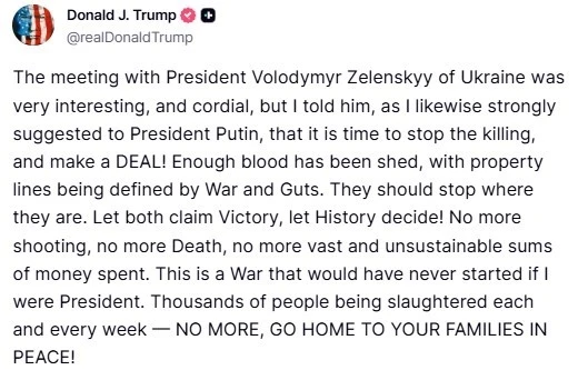 ABD Başkanı Donald Trump, Ukrayna Devlet Başkanı Vladimir Zelenskiy ile yaptığı görüşmenin ilginç ve samimi geçtiğini belirterek, "Ancak ona, daha önce Başkan Putin’e güçlü biçimde söylediğim gibi, artık öldürmeye son verme ve bir anlaşma yapma zamanının geldiğini söyledim. Bulundukları yerde durmalılar. Her iki taraf da zafer ilan etsin, kararı tarihe bırakalım!" açıklamasında bulundu.