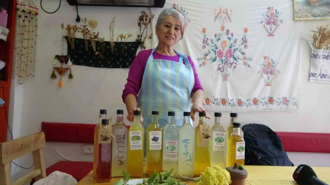 Tuncelili Saniye İldeniz, köyünde topladığı yenilebilecek her bitkiyi sirkeye dönüştürüyor.