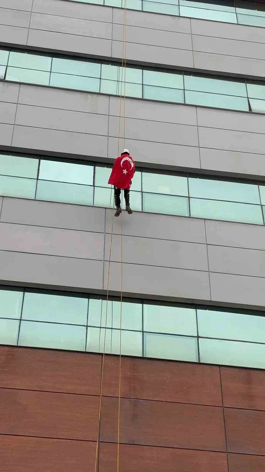 Aydın’ın efeler ilçesinde endüstriyel iple erişim uzmanı barış özbey, nusaybin-kamışlı sınır hattında türk bayrağına yönelik ypg terör örgütü yandaşları tarafından gerçekleştirilen saldırıya tepki göstermek amacıyla türk bayrağı ile yaklaşık 5 kat yüksekliğe tırmanarak bayrağı zirveye astı.