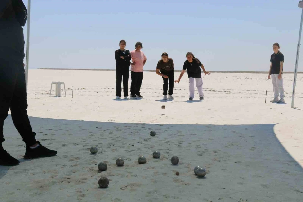 Aksaray’ın Eskil ilçesinde, 20 köy okulundan toplam 250 öğrenci, Tuz Gölü üzerinde bocce müsabakası yaptı.