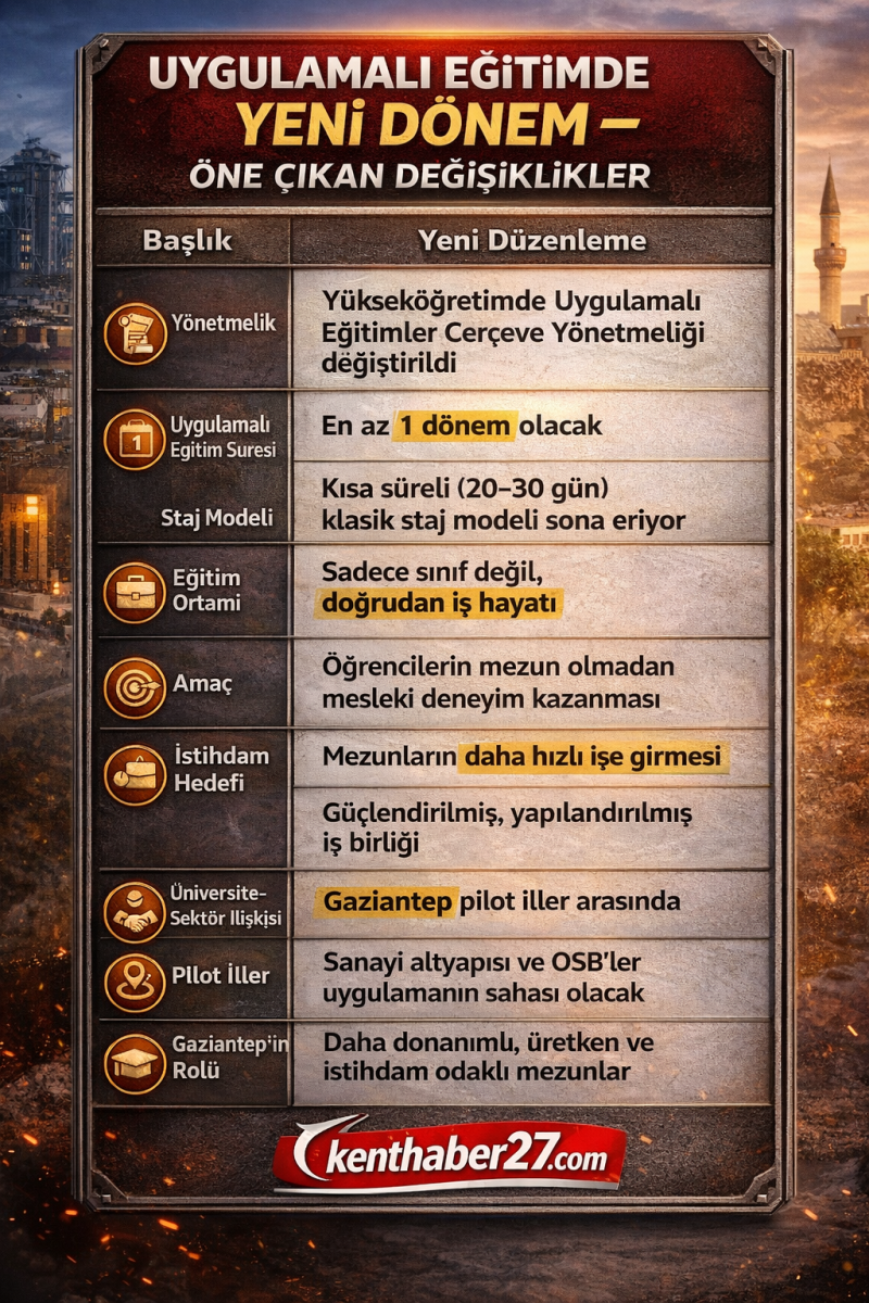 Bu kapsamda pilot il olarak seçilen Gaziantep, düzenlemenin en hızlı ve etkin şekilde uygulanacağı şehirlerden biri oldu. Güçlü sanayi altyapısı, organize sanayi bölgeleri ve üniversite–sektör iş birliği potansiyeliyle öne çıkan Gaziantep’te üniversite öğrencilerinin mezun olmadan önce iş dünyasıyla iç içe bir eğitim sürecinden geçmesi amaçlanıyor. Yeni uygulamanın, kentteki nitelikli iş gücünü artırması ve gençlerin istihdama geçiş süresini kısaltması bekleniyor.