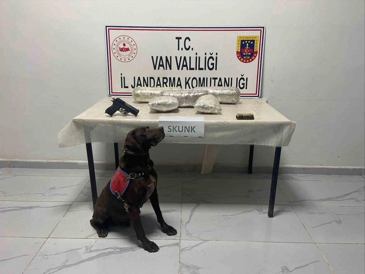 Van Valiliği’nden yapılan açıklamada, İl Jandarma Komutanlığı Narkotik Suçlarla Mücadele Şube Müdürlüğü ile Başkale İlçe Jandarma Komutanlığı ekiplerince yürütülen çalışmaların devam ettiği belirtildi. Açıklamada, "Başkale ilçesi Çamlık Mahallesi mevkiinde icra edilen faaliyet kapsamında, sürücülüğünü Y.T. (23) isimli şahsın yaptığı araçta, uyuşturucu madde arama köpeği Tütün’ün tepki vermesi üzerine arama gerçekleştirilmiştir. Yapılan arama sonucunda; 4 kilo 311 gram skunk maddesi, 1 adet tabanca, 63 adet tabanca fişeği, 2 adet cep telefonu ele geçirilmiştir. Olayla ilgili olarak şüpheli Y.T., Başkale Cumhuriyet Savcılığı’nın talimatıyla gözaltına alınmış ve hakkında adli işlem başlatılmıştır" denildi.