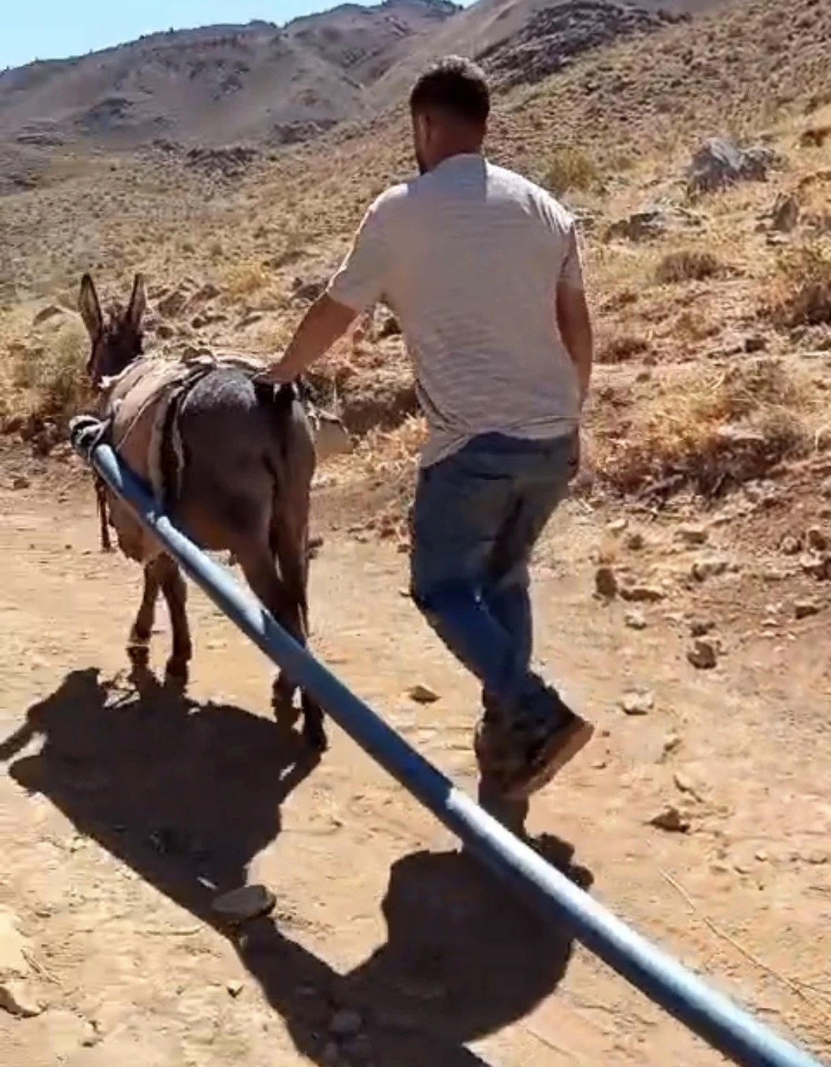 BİTLİS (İHA) – Bitlis’in Yolalan Belde Belediyesi tarafından yürütülen içme suyu hattı çalışmasında iş makinelerinin gidemediği bölgelerde malzemeler eşeklerle taşınıyor.