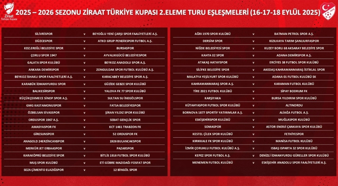 Ziraat Türkiye Kupası’nda 2. eleme turu maçları; 16-17-18 Eylül tarihlerinde oynanacak. Eşleşmelerde kazanan taraf, 3. tura yükselmeye hak kazanacak. Ziraat Türkiye Kupası 2. Eleme Turu’nda eşleşmeler şöyle: