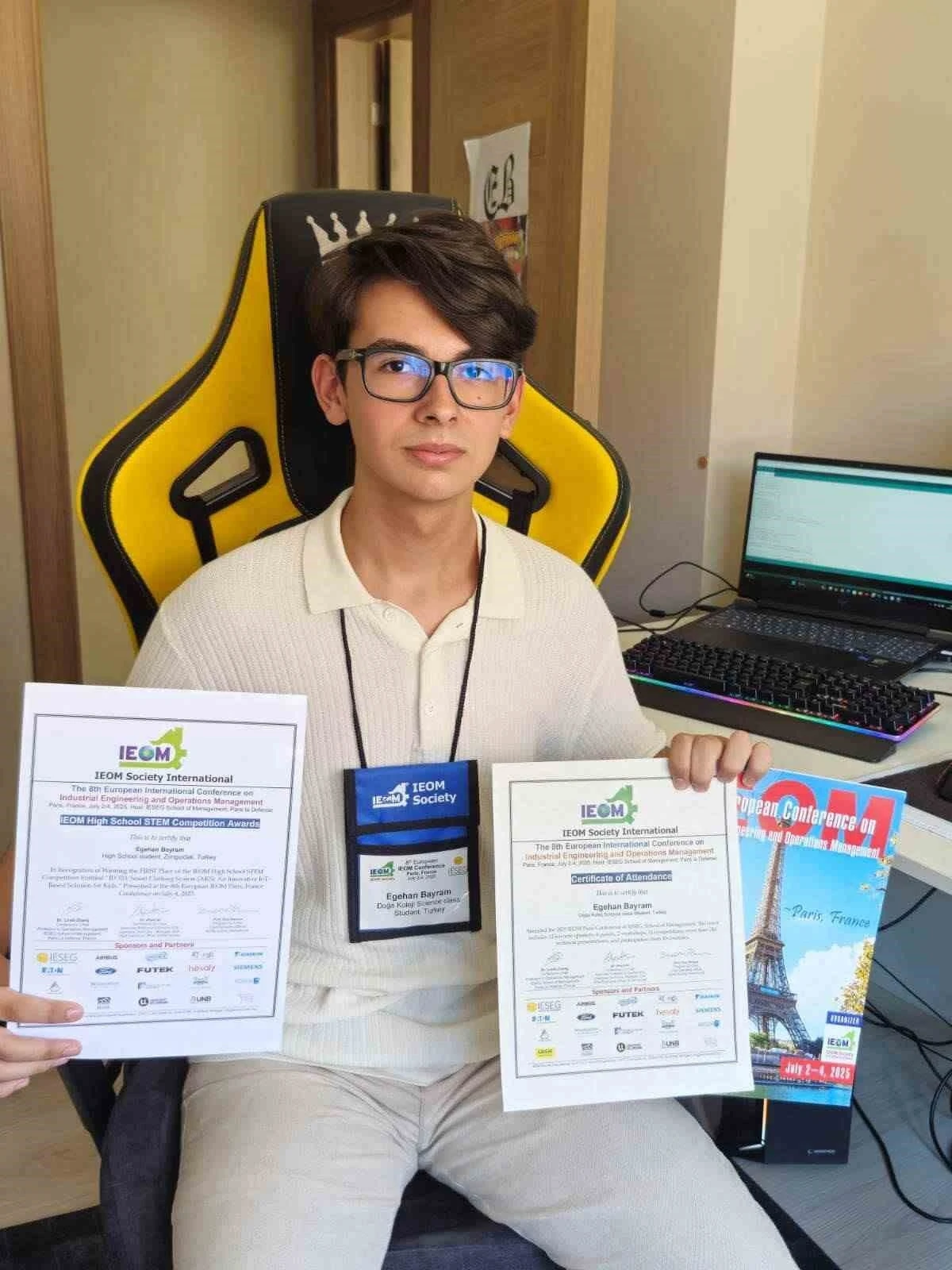 Karadeniz’in Ereğli ilçesinde 16 yaşındaki Egehan Bayram, Fransa’nın başkenti Paris’te düzenlenen 8. Avrupa Endüstri Mühendisleri ve Operasyon Yönetimi Konferansı’nda geliştirdiği "Yapay Zekâ Destekli Giyilebilir Bebek Kıyafeti" projesiyle dünya birincisi oldu.