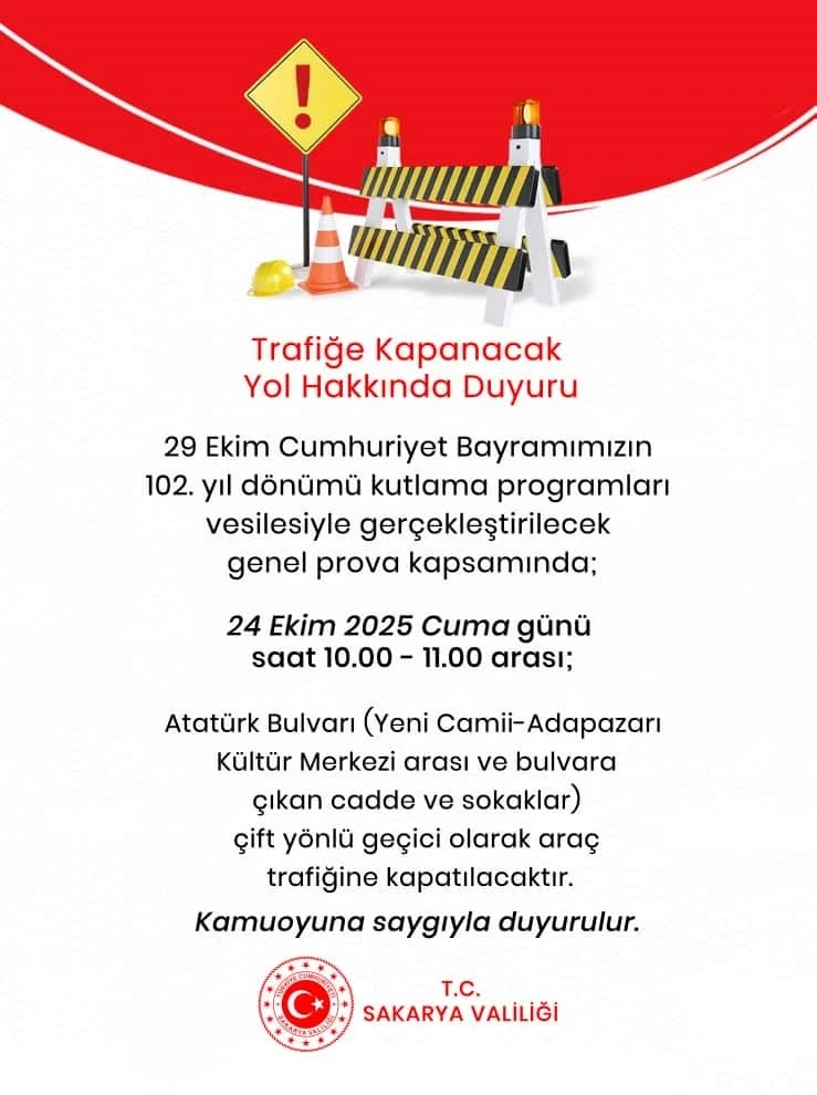 Sakarya Valiliği tarafından yapılan açıklamada, "29 Ekim Cumhuriyet Bayramımızın 102. yıl dönümü kutlama programları vesilesiyle gerçekleştirilecek genel prova çerçevesinde 24 Ekim Cuma günü Atatürk Bulvarı çift yönlü olarak araç trafiğine kapatılacaktır" ifadelerine yer verildi.