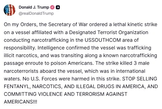 ABD Başkanı Donald Trump, ABD ordusunun uyuşturucu taşıyan bir tekneye saldırı düzenleyerek 3 erkek "narko-teröristi" öldürdüğünü açıkladı.