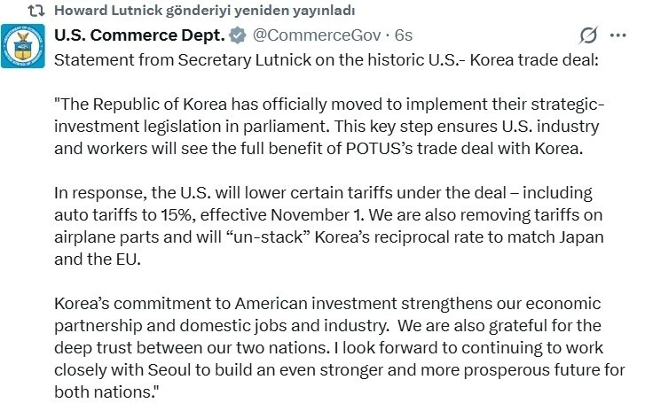 Bu adım karşısında ABD’nin de harekete geçtiğini ifade eden Lutnick, Washington’un da Güney Kore’den ithal edilen otomobillere uygulanan yüzde 25’lik gümrük vergisinde indirime gideceğini belirtti. ABD Ticaret Bakanı Howard Lutnick, "Buna karşılık ABD 1 Kasım’dan itibaren otomobil gümrük vergilerinin yüzde 15’e indirilmesi de dahil belirli gümrük vergilerini düşürecek. Ayrıca uçak parçalarındaki gümrük vergilerini kaldırıyoruz ve Güney Kore’nin karşılıklı tarife oranı Japonya ve AB ile aynı seviyeye getirilecek" dedi.