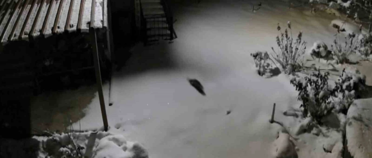 Güvenlik kamerasına saniye saniye yansıyan o anlarda sansarın kar üzerinde hızlı ve temkinli adımlarla ilerlediği, etrafı koklayarak yiyecek bir şeyler aradığı ve ardından gözden kaybolduğu görüldü.